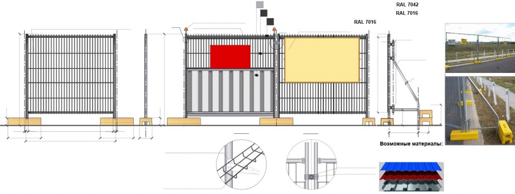 - предусмотрена возможность размещения опор, светильников и сигнальных маячков, применения вариантов заполнения панелей из различных материалов, пригодных по своим физическим и конструктивным свойствам для ограждений, в том числе монолитного поликарбоната, крепление пленочных, тканевых или сетчатых защитных пыле- и атмосферо-защитных экранов;