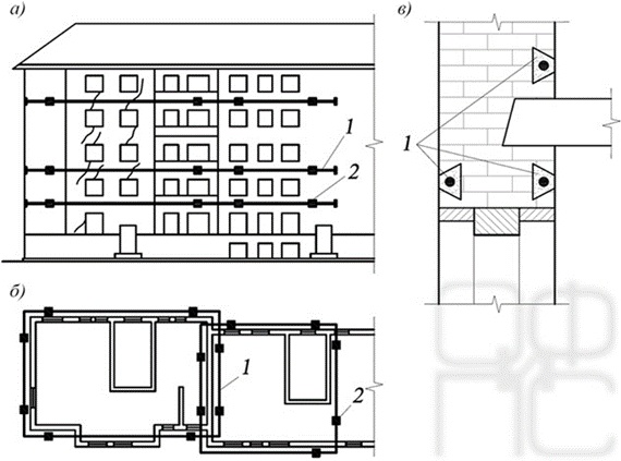 Рис. 2. Усиление здания напрягаемыми поясами а – фасад; б – план части здания; в – варианты размещения тяжей; 1 – арматурный тяж диаметром 22 – 32 мм; 2 – штраба