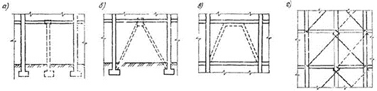 Увеличение пространственной жесткости сооружения изменением конструктивной схемы позволяет перераспределить усилия в конструкциях, обеспечив более эффективную их работу. Для этого можно установить дополнительные конструкции в виде стоек, подкосов, порталов, ввести связи, диафрагмы, распорки и др. (рис. 4). Усиление кладки должно быть доведено до конца и приведено к абсолютному восстановлению всех поврежденных зон. Важно вовремя осуществить реконструкцию, чтобы не допустить полного разрушения стен.