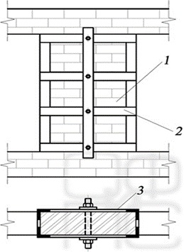 Рис. 5. Усиление кирпичного простенка металлической обоймой 1 – кирпичная кладка; 2 – металлическая планка; 3 – уголок