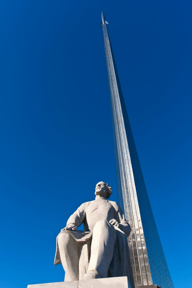 Монумент “Покорителям космоса” установили 4 ноября 1964 года в Останкинском районе Москвы. Памятник задумывался в честь успешного запуска первого искусственного спутника Земли, но пока разрабатывались проекты для конкурса, шел отбор заявок и проектирование работы победителя, уже начались пилотируемые космические полеты, поэтому было решено изменить посвящение монумента, и памятник получил название “Покорителям космоса”. По задумке автора, шлейф ракеты планировалось выполнить из дымчатого полупрозрачного стекла с ночной подсветкой, но конструктор-ракетостроитель Сергей Королев предложил облицевать монумент отполированными титановыми пластинами, не подверженными коррозии и отражающими небо. 250-тонную конструкцию вручную собирали на земле и поднимали при помощи специальных кранов.