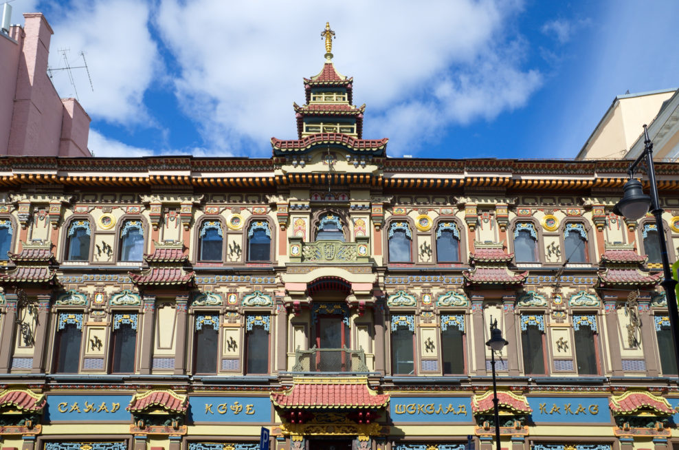 Его фасад украшают драконы, змейки, орнамент — каждая деталь буквально кричит о Востоке. И не даром, ведь внутри продавали настоящий китайский чай. Сооружение принадлежало купцу Сергею Перлову, чайному магнату, который пригласил для строительства своего магазина именитого архитектора Романа Клейна.