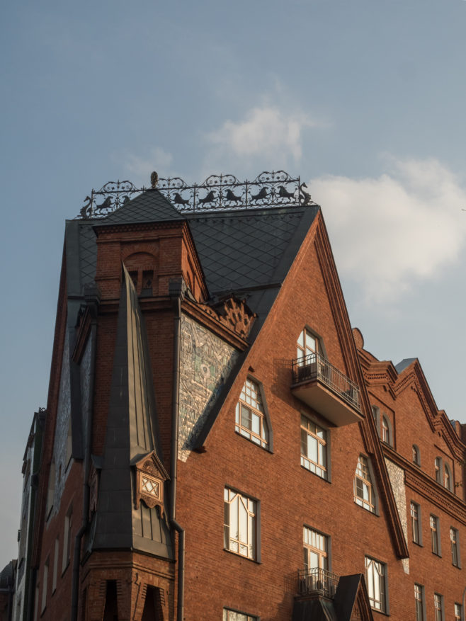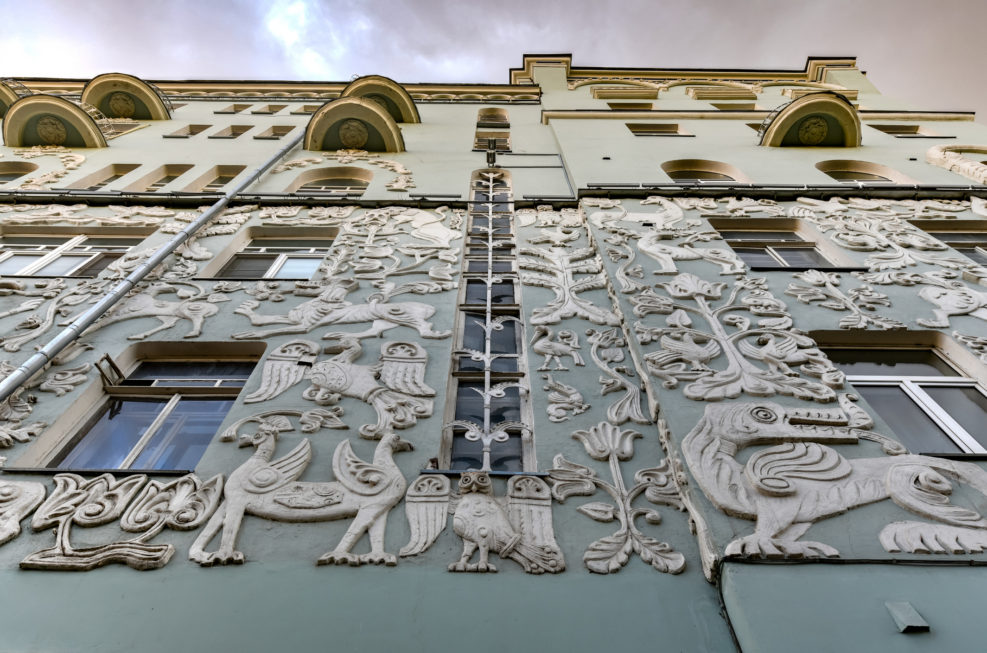 Это интересное здание, как ни странно, результат реновации. Такой же, что происходит в Москве и сейчас. В конце XIX — начале XX века на Чистопрудном бульваре сносили одно- и двухэтажные сооружения, а на их месте возводили массивные доходные дома с новейшими по тем временами инженерными конструкциями. Этот “Дом со зверями” строили для близлежащей церкви Троицы на Грязех на пожертвования купцов Оловянишниковых. Здесь некоторые квартиры предоставляли нуждающимся прихожанам, а остальные сдавали в аренду. Конструктивно дом максимально простой, но вот в список “Необычные здания Москвы” он попал благодаря своему фасаду, который украсил художник Сергей Вашков. По его эскизам третий и четвертый этажи выложили “ковром” из барельефов, изображающих сказочных зверей, птиц и растения.